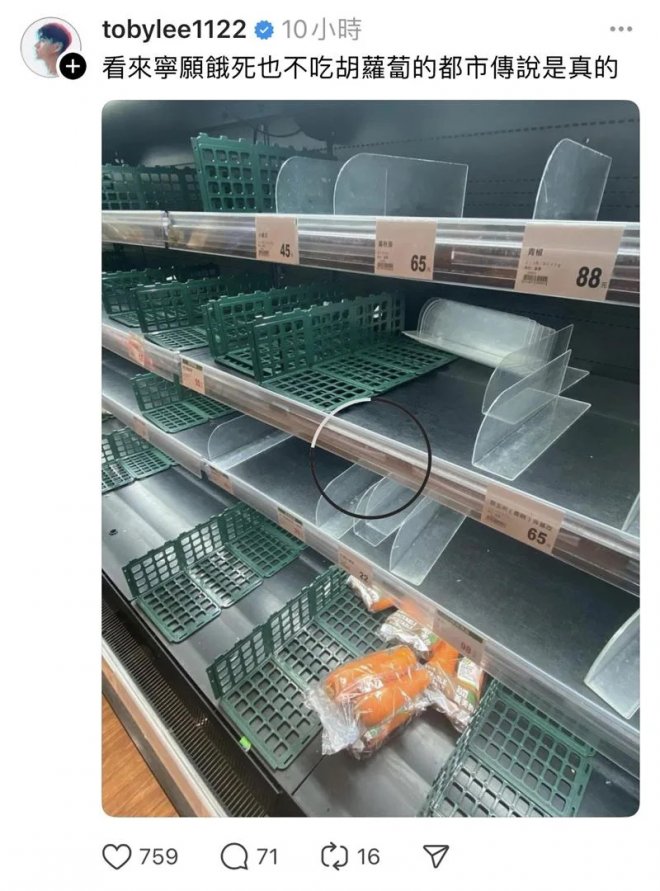 不僅如此,先前也有男星李程彬在Threads曬出一張賣場購物照,從畫面中可以看見,小黃瓜、黃秋葵、青椒、甜玉米、白蘿蔔以及其他蔬菜都被掃光,唯獨紅蘿蔔至少還剩下4袋,這辛酸畫面不禁讓李程彬感嘆「看來寧願餓死也不吃胡蘿蔔的都市傳說是真的」。