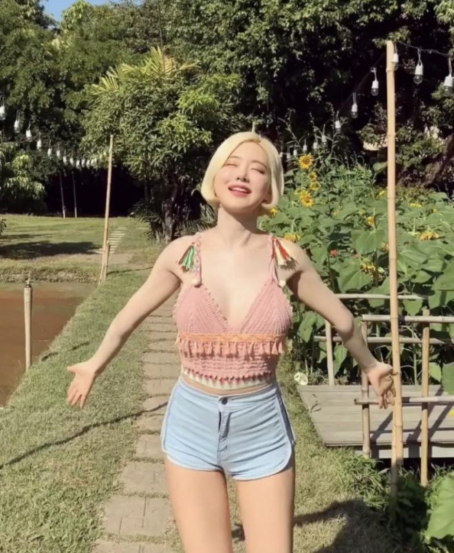 DJ Soda近日在IG上傳了在清邁觀賞向日葵的影片,畫面中的她心情愉悅,面對鏡頭總是保持甜笑,更吸睛的是,她身穿在當地夜市購買的背心及短褲,沒想到一個彎腰俯身,渾圓雙球呼之欲出,超兇上圍感覺就快掉出來,也立刻掀起粉絲暴動。