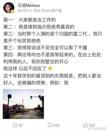 事實上,馬諾2019年才鬆口當年說「我寧願坐在寶馬裡哭,也不願坐在自行車上笑」的隱情,她表示大家都是去工作的,並且接到指示要拒絕該位男來賓,「當時那個人演的是個歸國的富二代,我只是開個玩笑拒絕他…覺得我說話不妥完全可以剪了不播。」