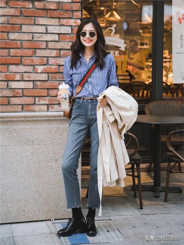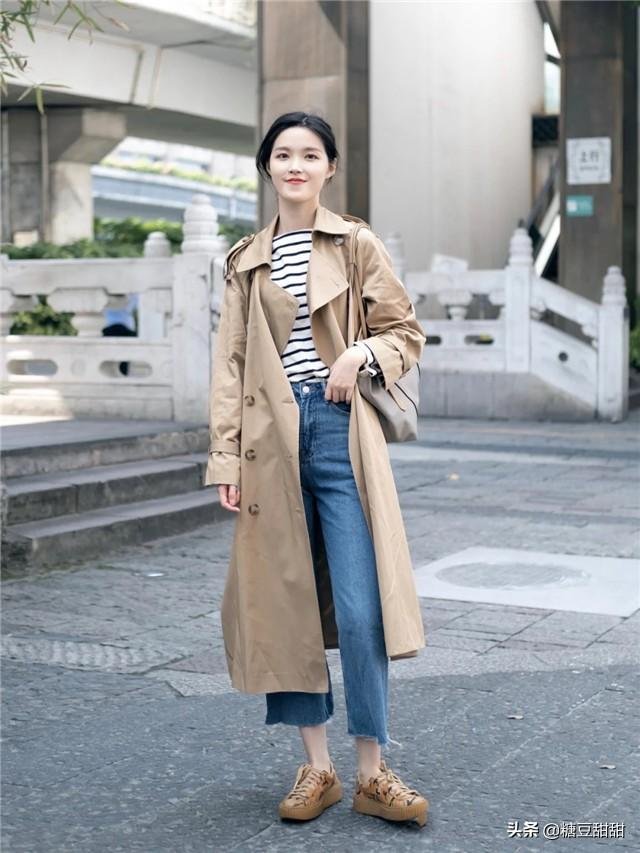 搭配建議:風衣+黑白條紋T恤+淺色牛仔褲