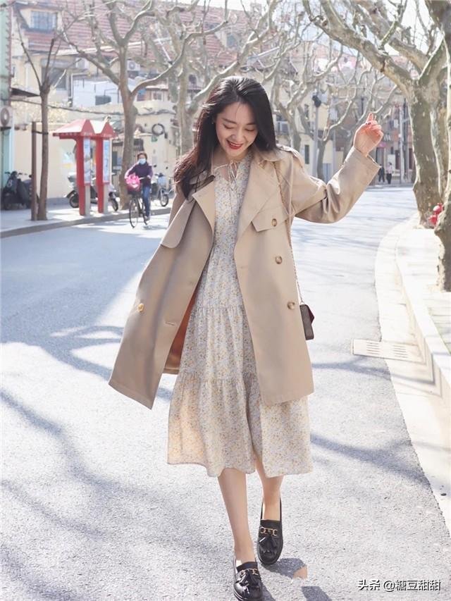 這個風衣和連衣裙都是屬於淺色系的,在色彩上就非常的和諧,既適合這個春光爛漫的日子,又方便打造溫婉可人的氣質,腳上再搭配一雙百搭的樂福鞋,真的是再合適不過啦。