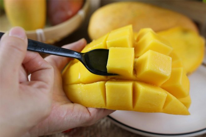 這裡教大家一個吃芒果的正確姿勢:首先避免接觸芒果皮,吃芒果時切成小塊,盡量不要將芒果汁接觸到嘴唇和臉部。吃完後及時用清水將沾在皮膚上的芒果汁洗凈,以防過敏。
