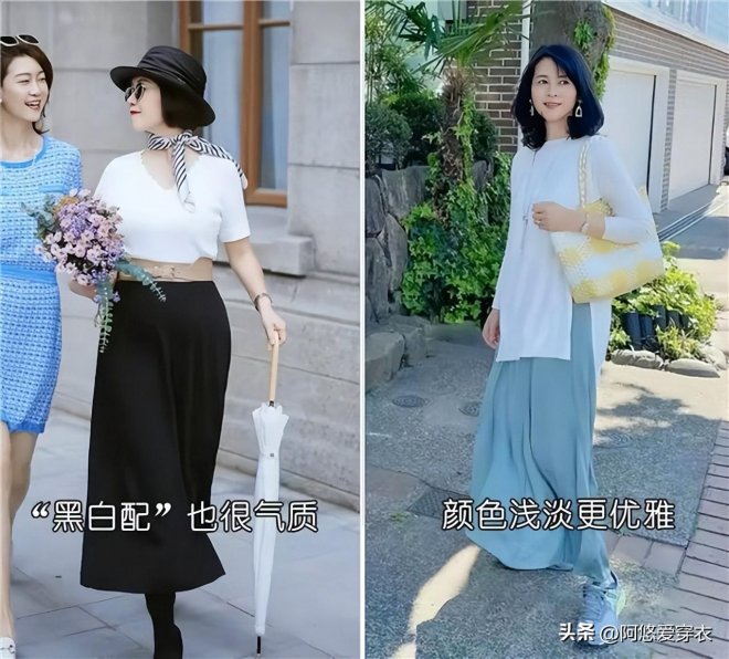 想要把裙裝穿得好看又高級,我們也要注重許多搭配思路,在顏色搭配上要注重色彩的平衡感。穿衣小白可以先試著用基礎色彩進行搭配,黑白配就很經典,但如果你的搭配能力不錯,又想要穿得清爽減齡,也可以用這種飽和度低的淺色單品搭配上裙子,展現出好氣質吧。