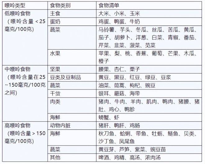 預防痛風,要「管住嘴」,盡量避免高嘌呤食物,嚴格限量中嘌呤食物,具體如何飲食小九給大家附上一張表,可自行對照食用。