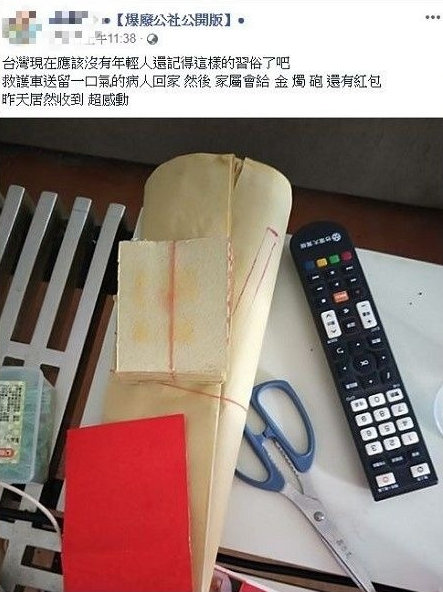 據《TVBS》報導,一位救護車司機在爆廢公社分享經驗,表示這次開救護車送留一口氣的病患回家,然後家屬給了他「金、炮、燭、紅包」,當下看到家屬都準備好在門口等,真的超感動,感慨:「台灣現在應該沒有年輕人還記得這樣的習俗了吧?」