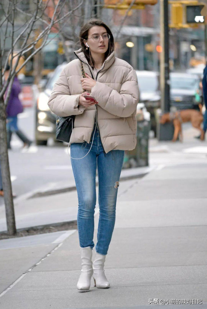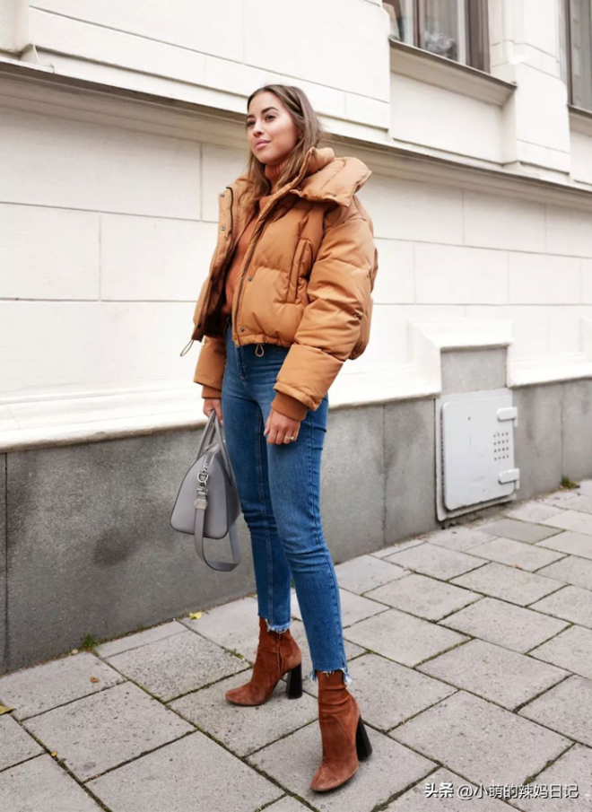 淺色的短款羽絨衣搭配牛仔面料小腳褲,又多了一絲的青春氣息。剛好能夠蓋到腳面的長度,不論是高跟鞋還是運動鞋都顯高,靴子可能會更顯成熟一些!