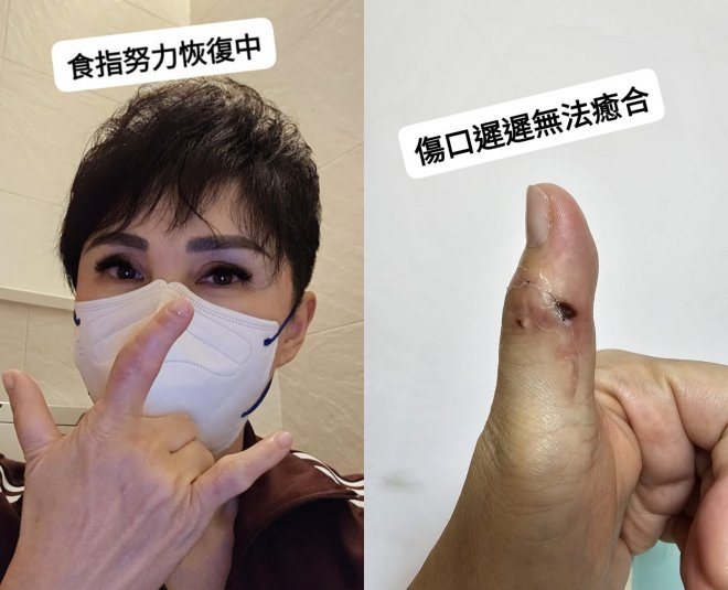 她表示在開刀後,大拇指的傷口一直沒有結痂跡象,反而加速感染,讓她只能苦吞2週的抗生素抑制。直到前2天才慢慢有長肉、癒合現象,讓她喜出望外,也在心中暗自禱告,「希望傷口不要再裂開!」。在這段過程中,她也結束旅行從日本返台。沒想到,才剛回到台灣的她,又染上流感,導致病情雪上加霜。