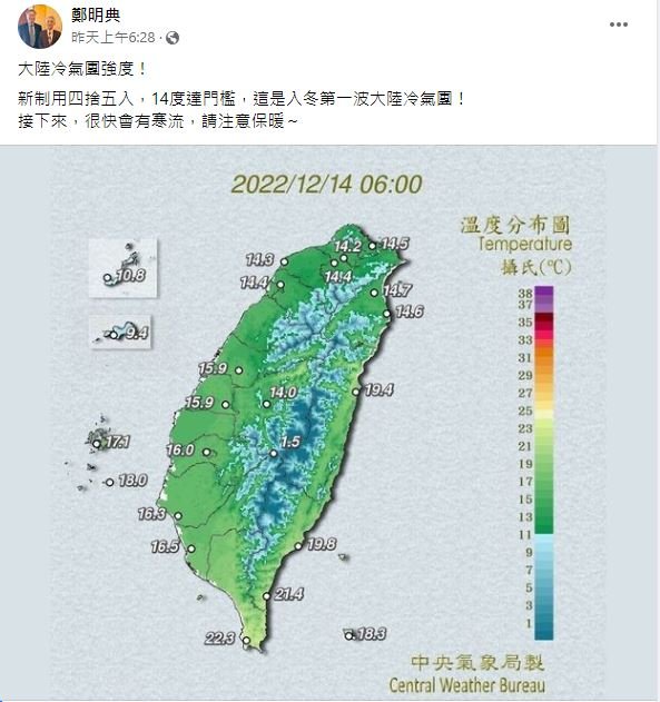 根據《TVBS》報導,昨日(14日)上午氣象局長鄭明典透過臉書曬出溫度分布圖,直指清晨6點台北測站顯示溫度為14.2度,以新制用四捨五入來看:「這是入冬第一波大陸冷氣團!」直呼很快就有寒流到來,請大家一定要做好保暖,千萬不要小看天氣冷,昨日萬華3小時內就傳出有2人猝死,一名79歲林姓街友在艋舺公園內,被發現時已明顯身亡,另外一名58歲廖姓街友則是被清潔人員發現倒臥在龍山寺地下商場的男廁內!