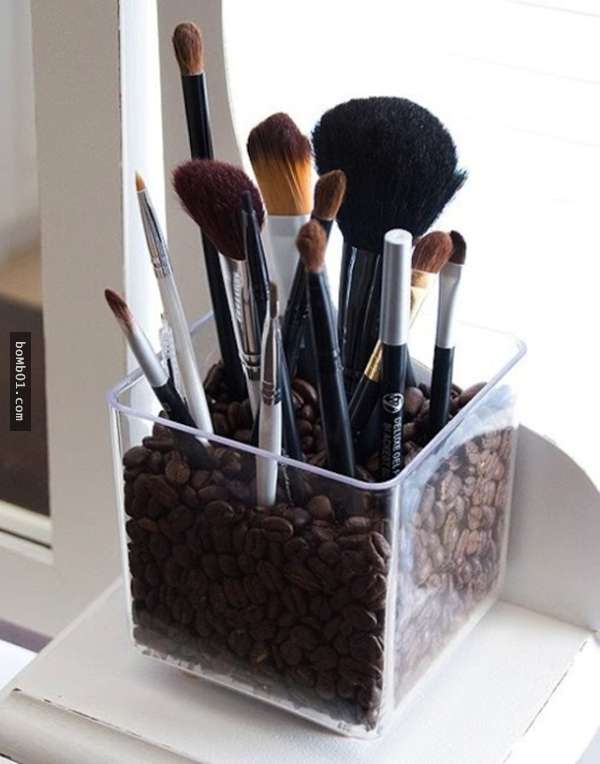 把你的化妝工具插在咖啡豆(或小石、玻璃珠)裡會更方便~