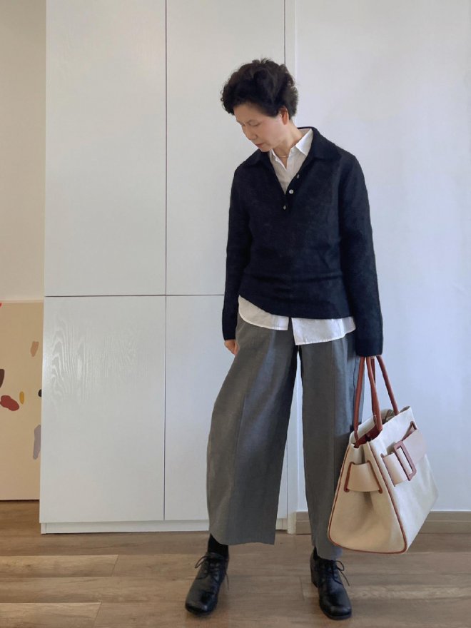 大齡女性想要營造出慵懶隨性的效果,一定不要錯過拖地褲的搭配,拖地長度的褲裝也要控制好分寸感,如果褲腳處顯得堆積感太強,也會影響到個人氣質。剛好蓋過鞋面的長度,再加上垂順性高的版型,自然能夠拉長腿型線條。