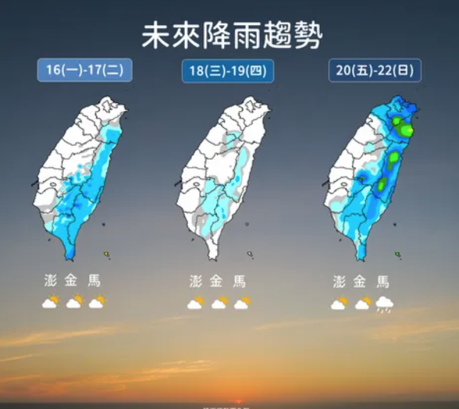 但從週五開始,又有一波東北季風來襲,且第二波挾帶的水氣較前次更多,影響區域也變得更廣,包含桃園以北、本島東部、恆春半島,以及北部山區都會出現局部短暫降雨,其他地區則是多雲到晴天,僅午後可能有偶發的雷陣雨出現。