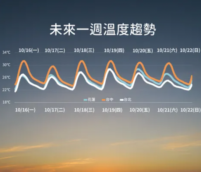 此外,氣溫方面,大致上與上週相差不大,但東北季風影響下仍有些許涼意,其中北部、東部變化較為明顯。這2區域的白天高溫可達25到27度之間,凌晨、深夜的溫度則下探到21至23度,週三、四則稍微上升1至3度。中南部地區白天則仍呈現暖熱型態,高溫可上看29到32度,凌晨與深夜的低溫則為23到25度間,溫差極大,建議民眾多帶一件衣物備用。