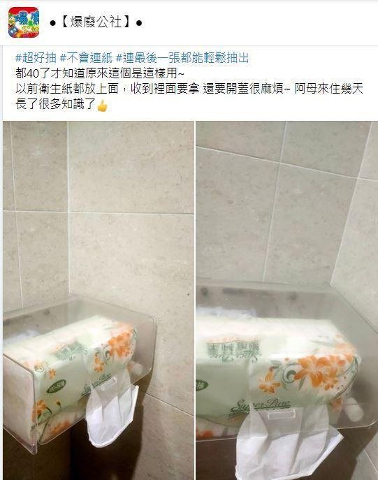 根據《三立新聞》報導,有女網友在臉書社團「爆廢公社」分享經驗,認為浴室的衛生紙收納盒一直覺得很難用,直言:「收到裡面要拿,還要開蓋很麻煩!」所以她一直把衛生紙放在盒子上面,直到媽媽來家裡住幾天,她才發現真正用法,讚嘆阿母讓她學到了:「都40了才知道這樣用!」