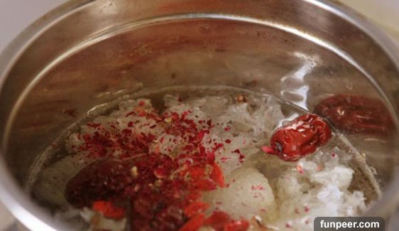 銀耳最好先在水中泡15分鐘,選材不要超級白的銀耳,銀耳不是約白越好,把所有的輔料都丟進鍋裡就好了。