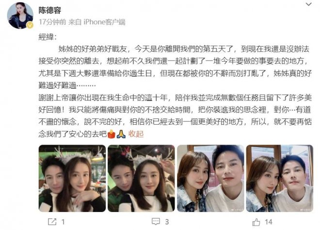 陳德容寫道:「經緯,姐姐的好弟弟,好戰友,今天是你離開我們的第五天了,到現在我還是沒辦法接受你突然的離去,想起前不久我們還一起計劃了一堆今年要做的事,要去的地方,尤其是下周大夥還準備給你過生日,但現在都被你的不辭而別打亂了,姐姐真的好難過,好難過。謝謝上帝讓你出現在我生命中的這十年,陪伴我並完成無數個任務,且留下了許多美好回憶!我只能將傷痛與對你的不舍交給時間,把你裝進我的思念裡,對你,有道不盡的懷念,說不完的好,相信你已經去到一個更美好的地方,所以,就不要再惦念我們了,安心的去吧」,文中並沒有過多透露胡經緯的離世的原因,但不難看出,胡經緯走得非常突然。