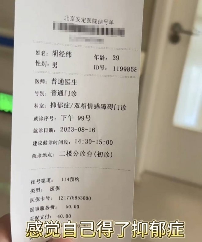 此外,因為焦慮和脫髮,胡經緯曾一度懷疑自己患上了抑鬱症,並前往安定醫院檢查。不過,一大堆檢查後,醫生稱,他沒有抑鬱症,只是有些焦慮。