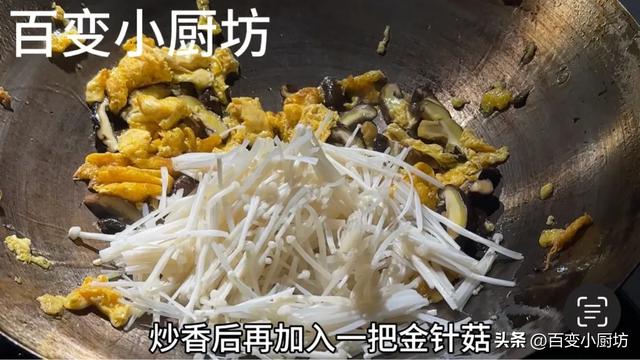 雞蛋液完全定型後,我們把它打散一點。然後把香菇片倒進來,翻炒出香菇的香味,炒香後再加入一把金針菇,適量的白菜,大火翻炒30秒。
