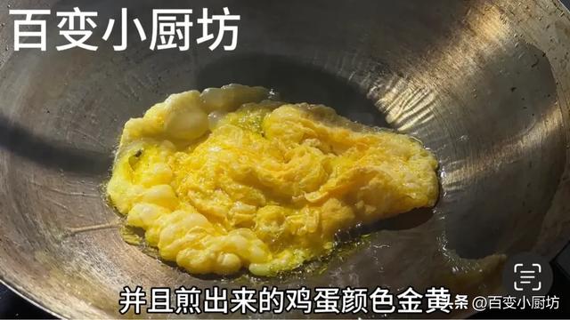 接著鍋裡面倒油,油8成熱,將準備好的兩個雞蛋液倒進來,整個過程開大火,這樣雞蛋液才更容易被烹起來。