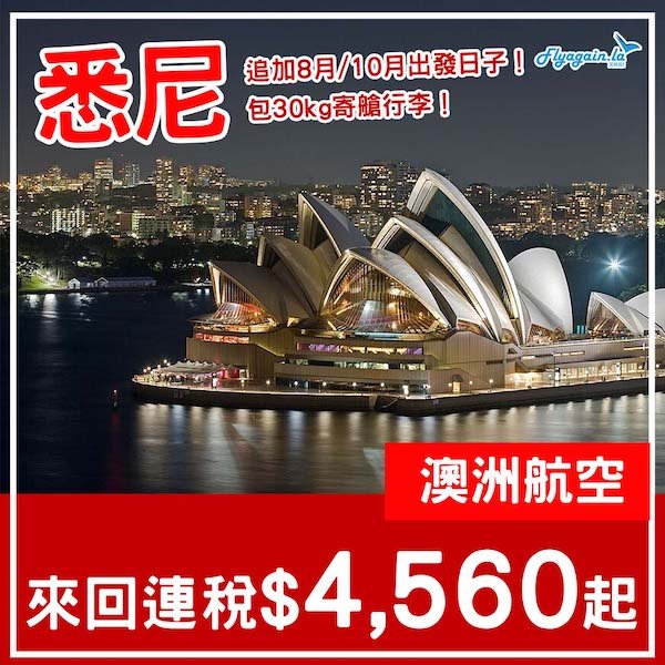 【悉尼】追加日子減價!包30kg寄艙行李!澳洲航空直航來回悉尼連稅$4,560起!6月尾至10月尾出發