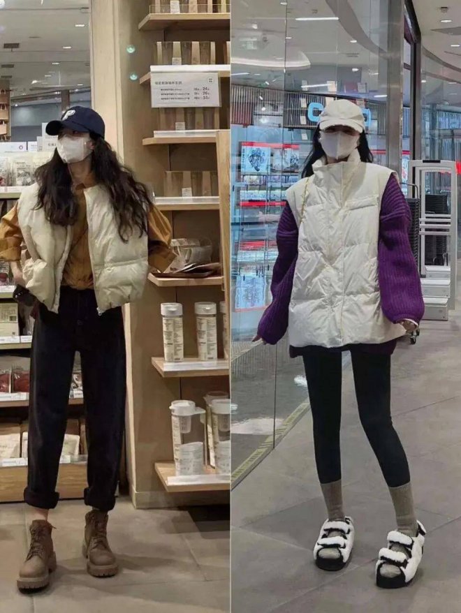 但是紫色是非常神秘浪漫的顏色,但是深紫色的話難免也會給一種老氣感,這個時候適當的運用一些米色白色的單品與之進行搭配就能夠協調紫色的老氣感,紫色的針織衫搭配上白色的羽絨馬甲,保暖又顯氣質,簡約乾淨,利落大方。