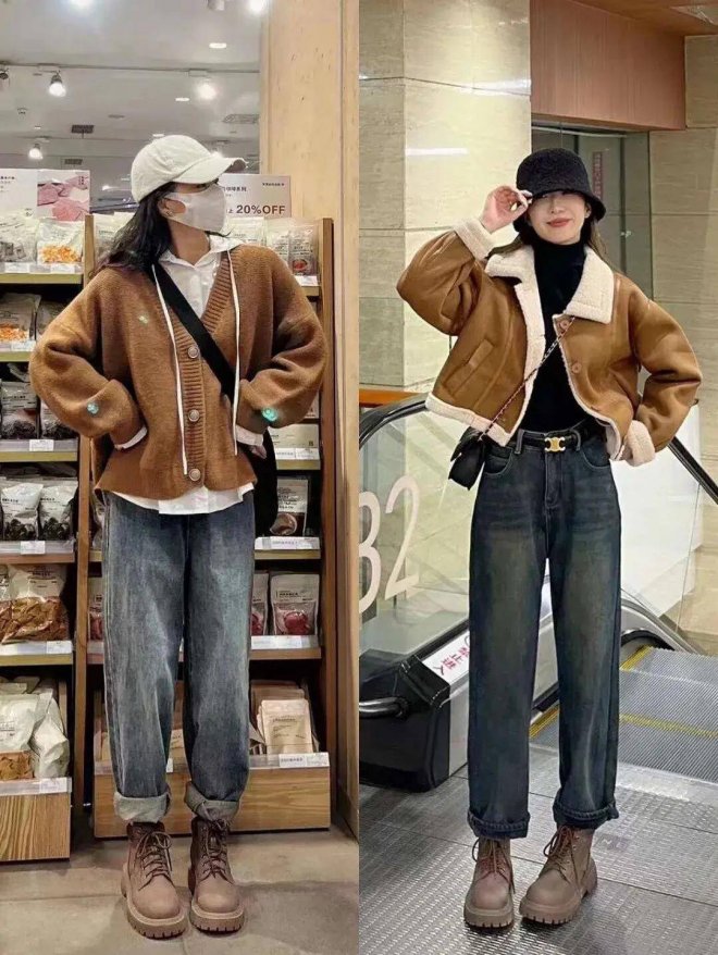 因此,在秋冬季節,可以藉助一些棕色的外套來進行穿搭,例如下面這一身棕色的皮毛一體外套,穩重內斂,霸氣灑脫,下半身簡單的搭配上一條牛仔寬褲之後,就能夠穿出滿滿的灑脫感和優雅溫柔感了,又美又颯,時髦精緻又利落。