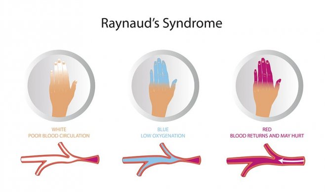 雷諾綜合征是指由於血管痙攣而引起的一系列血管血流減少的情形,手腳都會受到波及,通常是由於暴露在寒冷環境中引起。