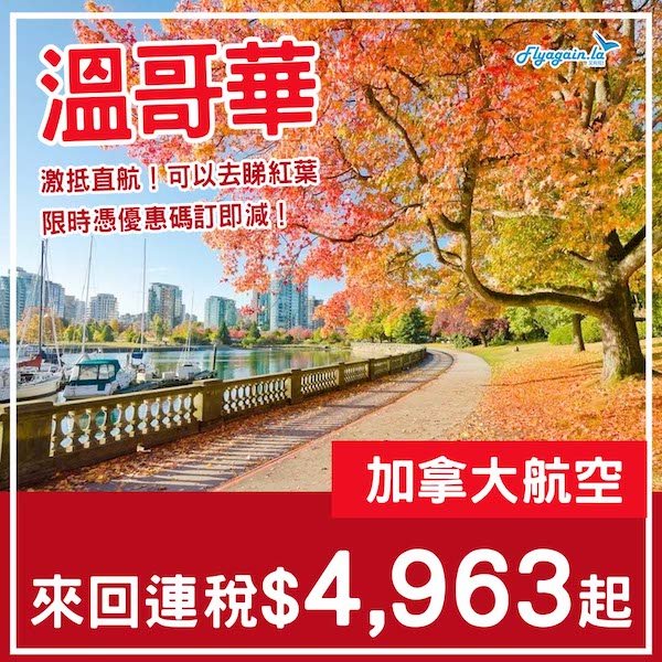 【溫哥華】繼續鬥減!用埋優惠碼五千有找!加拿大航空來回溫哥華連稅$4,963起!9月頭至12月頭出發