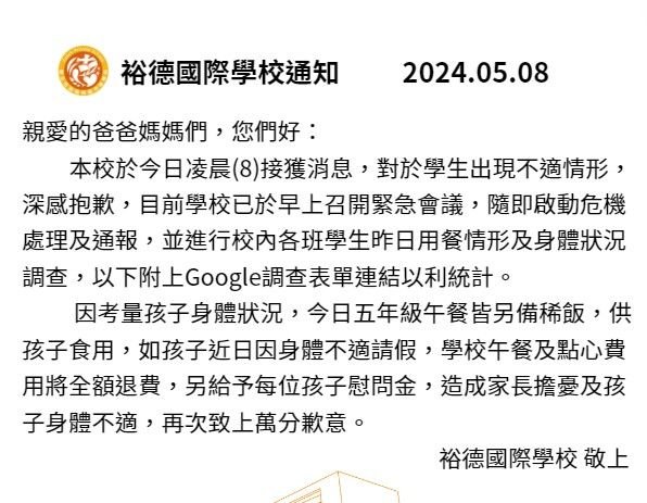 新北私立裕德國際學校7日時舉行小學五年級「校外食農教育活動」,一共有250多名學生、10幾名老師參與,並前往台中新社農會參訪。不過,當天晚上卻傳出150多名學生、5名教師出現上吐下瀉的狀況,其中有4名學生發燒住院,疑似是食物中毒。目前校方已通報教育局校安中心,校長李慶宗也於稍早出面說明。