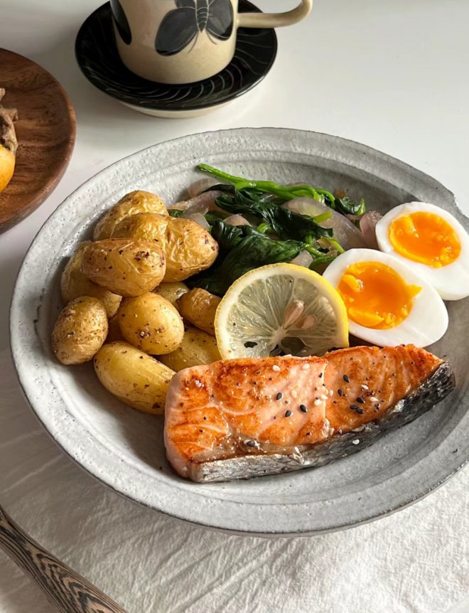 健康美式早餐推薦-蒸馬鈴薯+煎鮭魚(310大卡)蒸馬鈴薯富含複合碳水化合物和纖維,為身體提供長效能量,同時鮭魚則是優質的蛋白質來源,同時提供了豐富的Omega-3脂肪酸,有助於心血管健康和抗發炎。