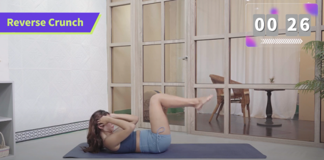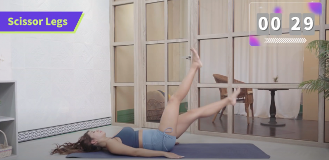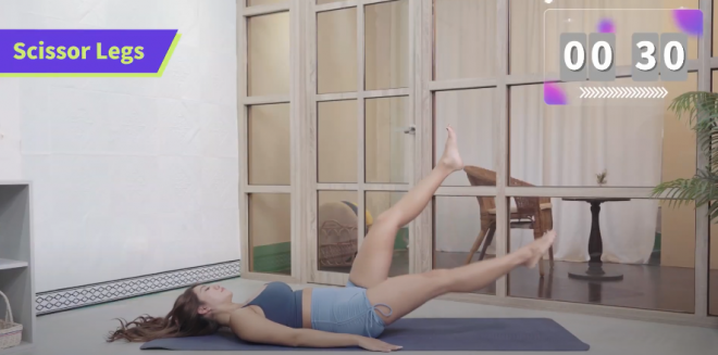 剪刀腿剪刀腿也是核心訓練裡常見的動作,兩條腿在空中抬起,輪流一上一下,為了撐住雙腿,腹部會相當用力,因此要配合好呼吸的節奏喔~