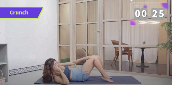 收腹雙腿拱起,微微抬起上半身,左右手輪流碰觸右膝和左膝,感覺背部有拉伸的感覺,腹部有點痠脹,那就沒錯了~堅持下去!