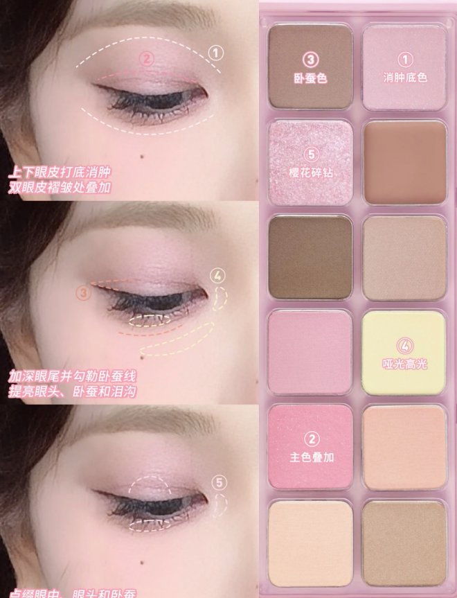 簡易版櫻花粉色眼妝怎麼畫?1.沾取眼影盤中最淺色眼影(一般為米色或淺粉色)大面積為上眼皮打底