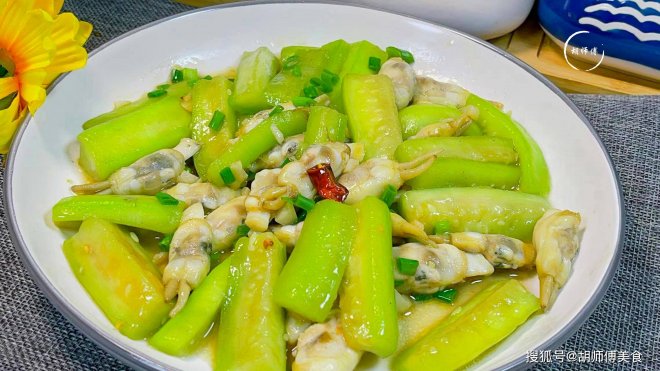 食材準備:絲瓜1根、蟶子500克、乾辣椒、生抽、蒜末、蔥花、食鹽、雞精、食用油適量。