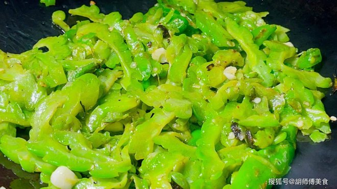 4、鍋中放入一勺豬油,等油溫燒到6成熱後,把蒜末、豆豉放入鍋中爆香,接著將苦瓜、青椒、食鹽、雞精放入鍋中,爆炒半分鐘即可起鍋食用。