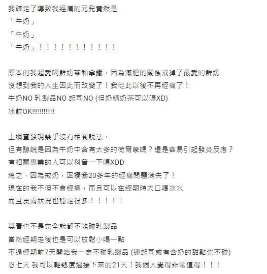 「忍7天,我可以輕鬆度過接下來的21天!個人覺得非常值!」現在她不僅不會經痛、還能大口喝冰飲,皮膚狀況也穩定許多,她也建議女孩們若有經痛困擾,請先至婦產科檢查是否罹病?若沒有,則可試試經前禁食乳製品,沒想到這篇貼文引起熱烈迴響,不少網友都回饋結果:「馬上實驗,終於沒感受到痛,雖然肚子還是有點悶,但終於不會痛到打滾。」