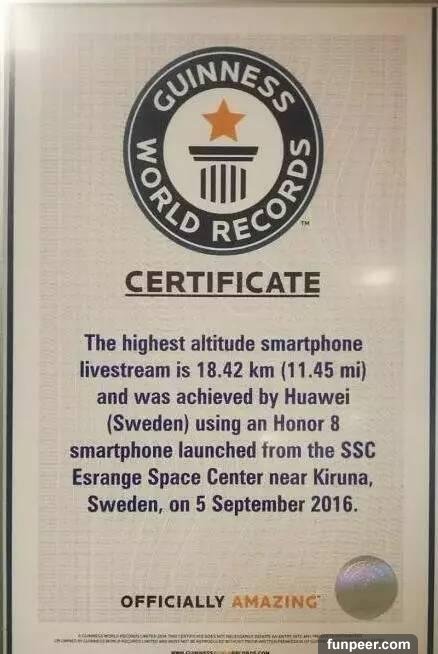 近日,在一場吉尼斯記錄的智慧型手機性能測試中,華為榮耀8性能碾壓所有智慧型手機,成功登頂世界第一!這款榮耀手機從瑞典的航天中心,坐上火箭發射升空,到達了18.42公里高度,成功獲得了:達到高度最高的智慧型手機金氏世界紀錄。\