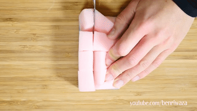 找一塊乾淨的海綿,像這樣橫著、豎著交叉切成小方塊,注意不要把海綿切斷。