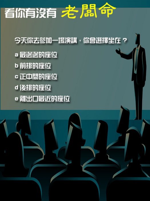 你對自己的要求高,總是希望能做到最好!不想輸人的性格,讓你的壓力不小。建議選到這選項的人,需要安排一段旅行充電自己會是最好的。