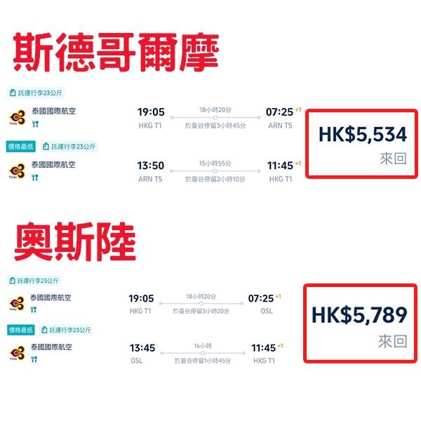 【北歐】罕有平飛!可以open jaw!泰國航空來回奧斯陸/斯德哥爾摩連稅$5,534起!5至9月指定日子出發
