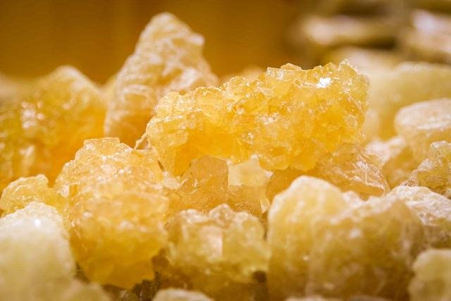 其中黃色的冰糖是比較原始的冰糖,它沒有經過更多的工藝進行脫色處理,而這種比較原始的黃色冰糖,裡面保留的甘蔗成分也比較多。