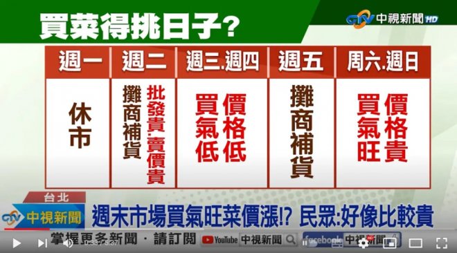 據《中時新聞》報導,事實上,菜市場每天的價格會隨著攤商的運作機制調整,由於菜市場大多在周一休市,到了周二,攤販就會去批發商那裡補貨,因為周二的批發價格比較貴,所以攤販賣出的價格也會比較貴。