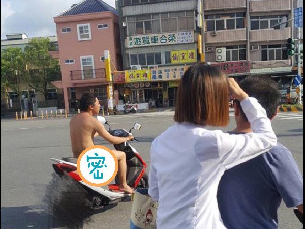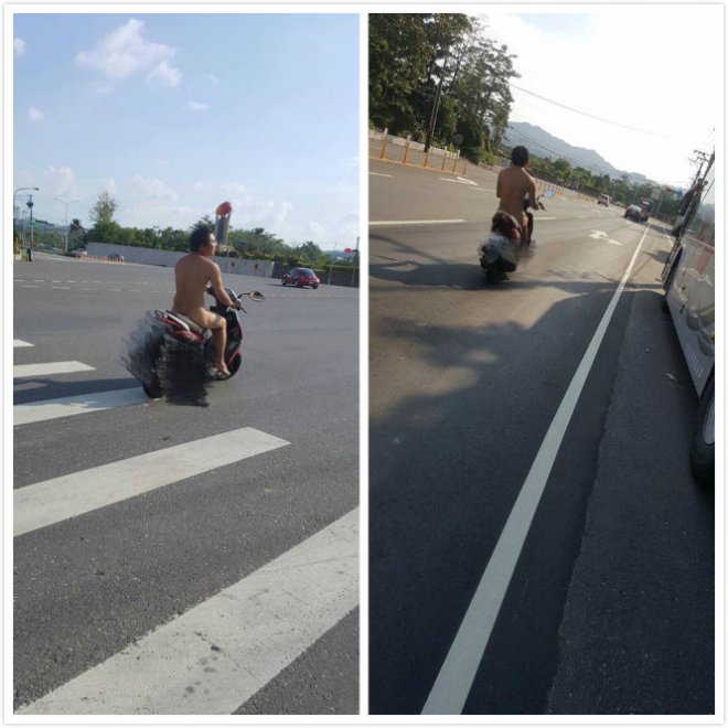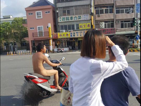 網友在臉書爆料公社貼出多張照片,只見照片中一名騎著紅色機車的男子竟全身赤裸,連安全帽都沒戴上,讓原PO相當傻眼,表示「到底是天氣太熱還是景氣太差買不起衣服呢?」,且照片中也可以看到其他路人看到男子也萬分傻眼,不斷盯著他指指點點。