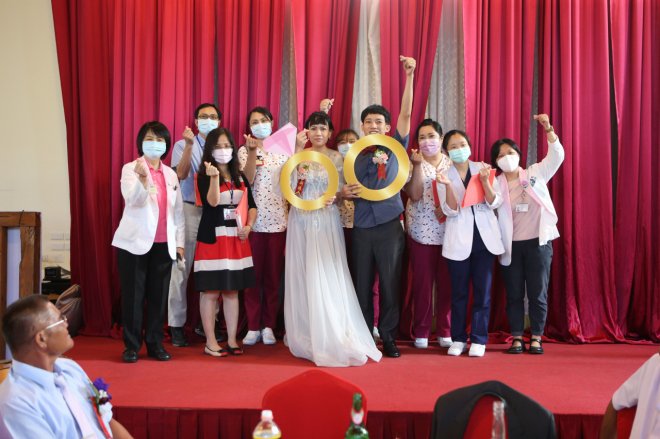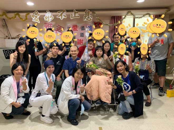 就像當初選擇積極治療一樣,堅強的雅君選擇直面噩耗,透過門諾醫院團隊協助下,她在病房舉辦生前告別式,向所愛的人好好道別,10多位親友放下工作,從各地趕來,在雅君的病房門口看著她和丈夫冠倫自製的影片,回憶著過往點滴...