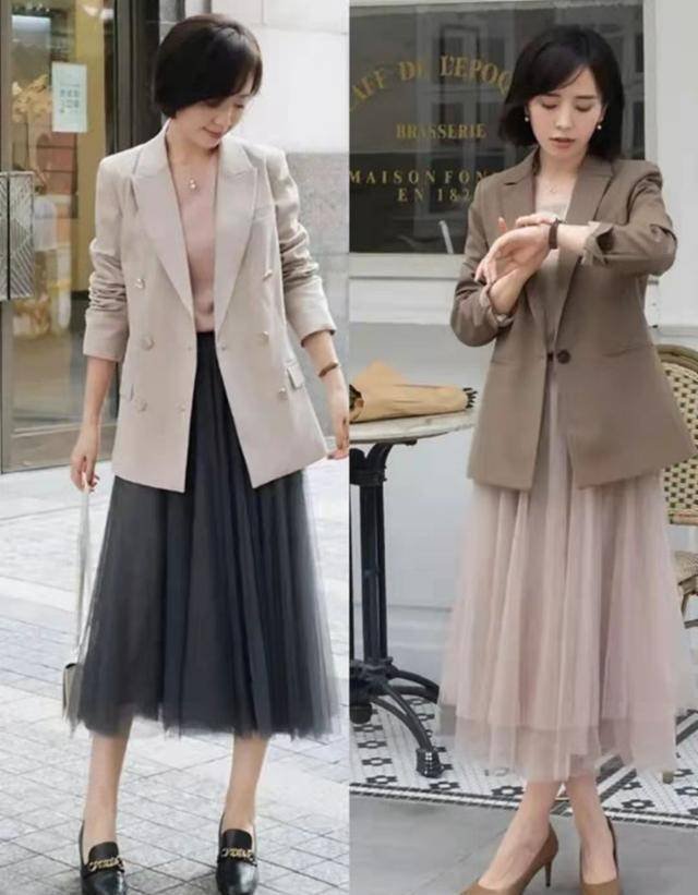 尤其是輕紗過膝裙,與西裝構成柔與力的碰撞,美得恰到好處。