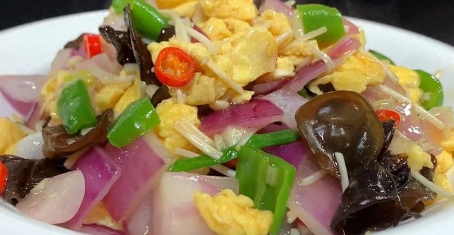 8.差不多就可以出鍋了,這樣做出來的洋蔥炒蛋非常的鮮美,因為洋蔥我們要多吃一點,多吃一點洋蔥對我們的身體也是非常的棒的。