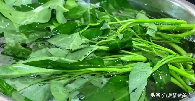 1.空心菜裡面加入一勺食用鹽,再加入一勺小蘇打,然後我們再倒入大量的清水沒過空心菜,完全清洗乾淨了,把空心菜的桿給它分開切,然後把空心菜的桿給它裝入大一點的盆裡面,葉子也放到盆裡面。
