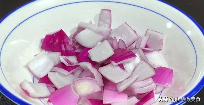2.準備一個洋蔥,切成小塊。小碗中打入三個雞蛋,攪拌均勻,把洋蔥來腌制一下,加入一點食用油,攪拌均勻。腌制20分鐘,把金針菇把切成小段,倒入清水,清洗一下。浸泡十分鐘。