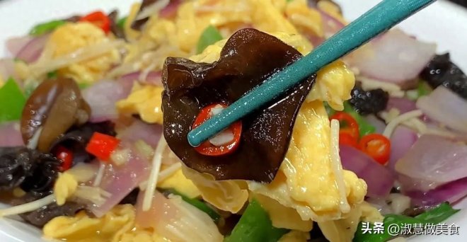 7.起鍋加入少料的食用油,把姜、蒜末、小米辣全部放入鍋中,炒香以後再把青椒加進來,全部炒香以後再把洋蔥加進來,翻炒均勻,把木耳、金針菇、雞蛋也加進來,再把調好的料汁一起加進來,快速的翻炒一下,
