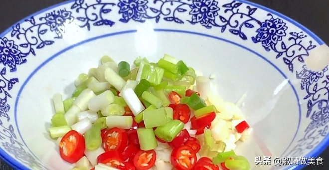 3.大蒜切成蒜片,改刀剁成蒜末,一些小米椒切成小圈,一把小蔥,把蔥葉和蔥白分開切,把蔥白給它切成蔥花,剩下來的蔥葉也把它切成小段,切好以後倒入碗中備用。