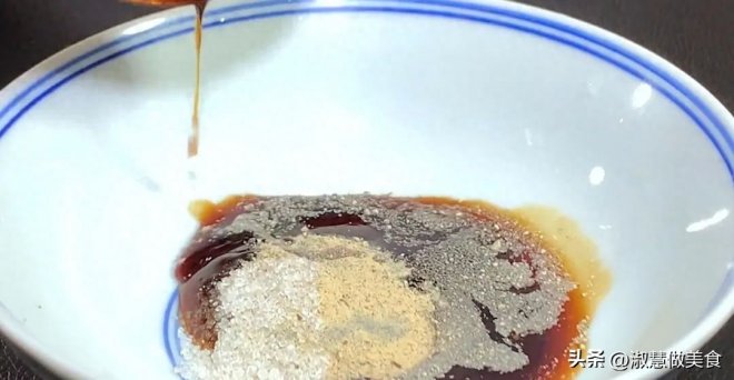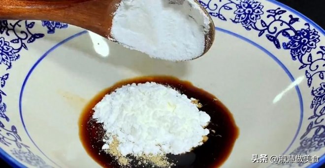 3.調個料汁,一勺食用鹽,再加入一點生抽、醬油,少量的胡椒粉,一勺玉米澱粉,再倒滿一小碗清水,用勺子將它攪拌一下,攪拌均勻。